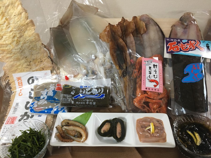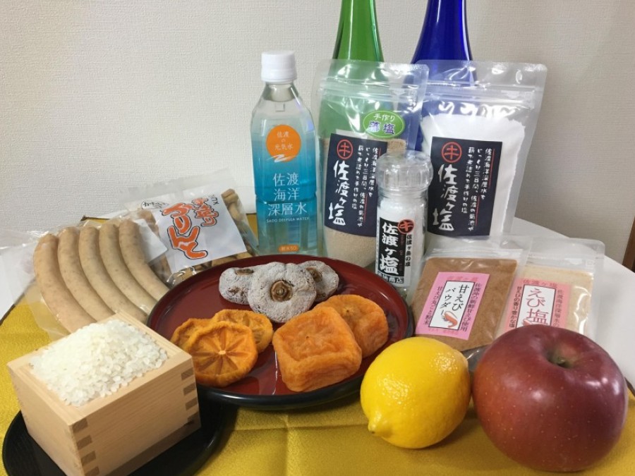 お米、おけさ柿、柿シャーベット、干し柿、ルレクチェ(洋梨)、いちじく、フルーツジャム、ドライフルーツ、乾燥シイタケ、とび魚だし、海洋深層水手作り海塩、藻塩、南蛮えび塩、柿酢、地酒各種、海洋深層水、ボイル茶豆、だんご、かりんとう、乳製品各種、佐渡牛、ハンバーグ、ソーセージ、朱鷺そばetc
